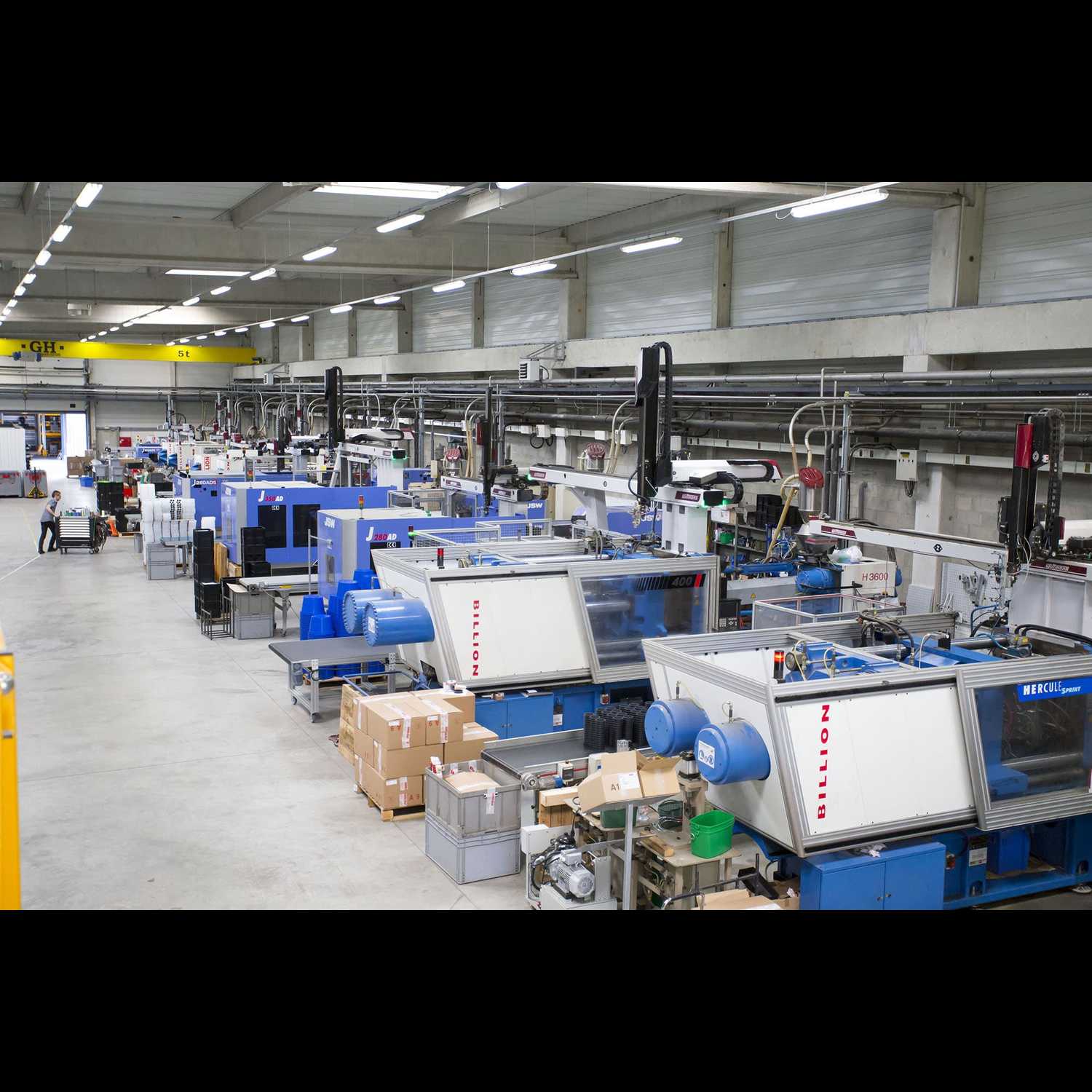un atelier de fabrication moderne, respectueux de l'environnement, avec une équipe maîtrisant notamment la plasturgie à la perfection